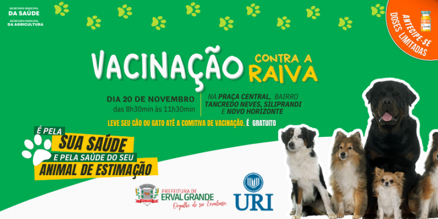 Através da Inicicativa em parceria com o curso de Medicina veterinária da Uri Campos Erechim – Será realizado no dia 20 de novembro a vacinação gratuita contra a raiva para cães e Gatos.
