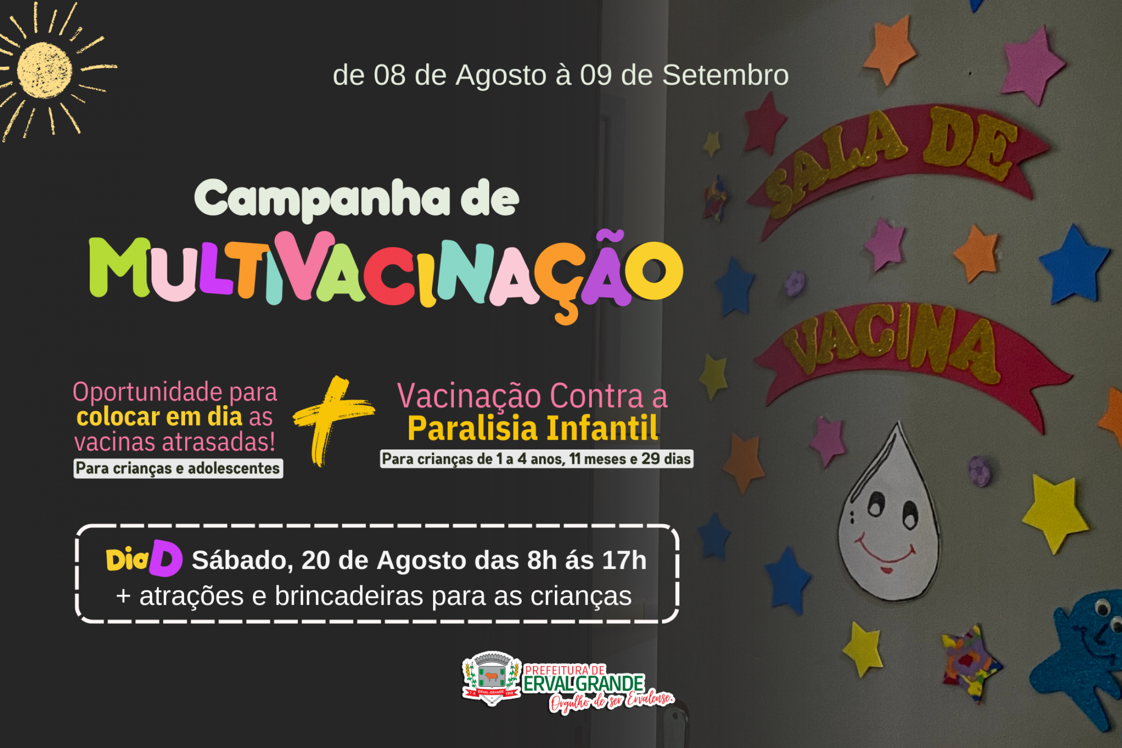 O Dia “D” no município de Erval Grande será realizado no sábado, 20 de agosto, das 8 às 17 horas na UBS – em anexo ao Pronto Atendimento do Hospital e contrá com atividades recreativas. Compareça munido de CPF e caderneta de vacinação.
