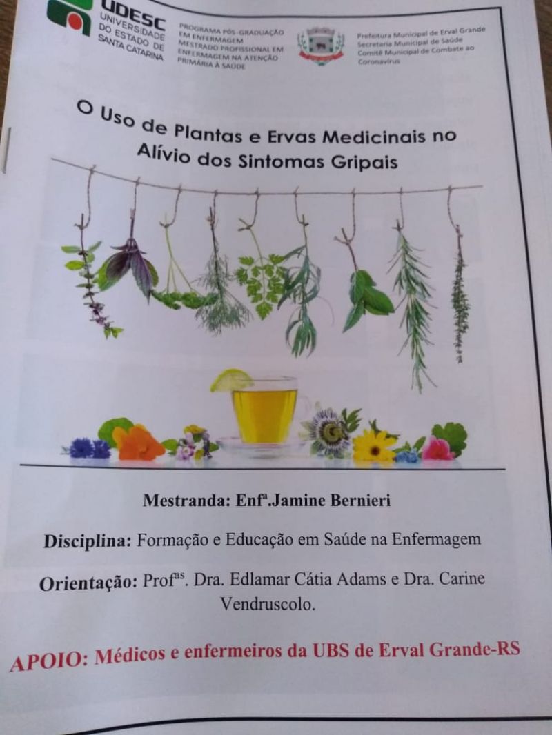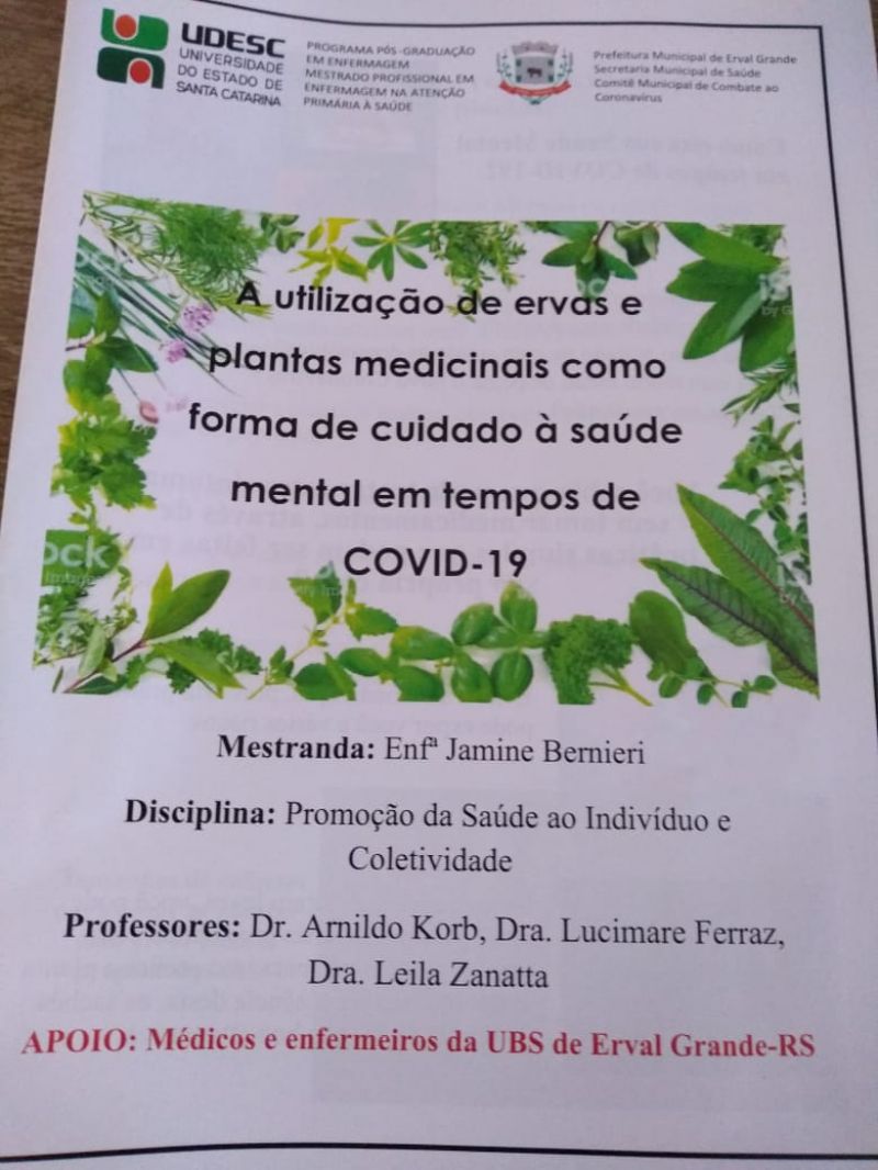 A Enfª Jamine Bernieri, aluna do Mestrado Profissional em Enfermagem na Atenção Primária à Saúde da UDESC-SC, em parceria com médicos e enfermeiras da Unidade Básica de Saúde do município de Erval Grande-RS, desenvolveram uma ação voltada a promover a saúde da população ervalense, através da utilização de plantas e ervas medicinais como forma de cuidado durante este período de pandemia por Coronavírus.