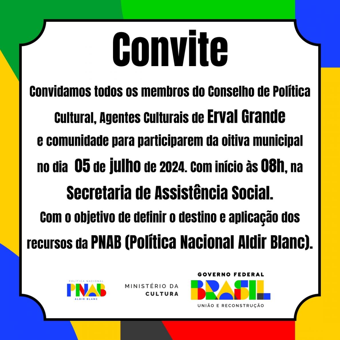 Convidamos todos os membros do Conselho de Política Cultural, Agentes Culturais de Erval Grande e comunidade para participarem da oitiva municipal no dia 05 de julho de 2024. Com início às 08h, na Secretaria de Assistência Social. com o objetivo de delinir o destino e aplicação dos recursos da PNAB (Política Nacional Aldir Blanc).